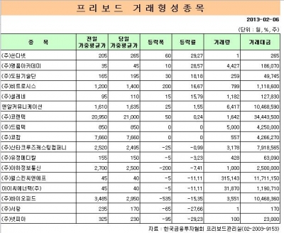 6일 금융투자협회 프리보드에 따르면 프리보드 지수는 전일대비 64.60포인트 하락(-0.39%)한 1만6300.45포인트, 프리보드 벤처지수는 전일대비 254.09포인트 상승(-1.12%)한 2만2469.20포인트로 마감했다.