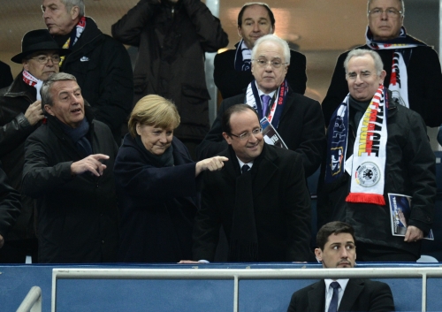 앙겔라 메르켈(두번째 줄 왼쪽 두번째) 독일 총리가 6일(현지시간) 프랑스 생드니의 스타드드프랑스경기장에서 프랑수아 올랑드(오른쪽) 프랑스 대통령과 독일 대 프랑스의 축구경기를 관람하고 있다. 생드니/AFP연합뉴스