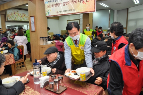 ▲최평락 중부발전 사장이 마포구 어르신들에게 떡국 배식 봉사를 하고 있다.