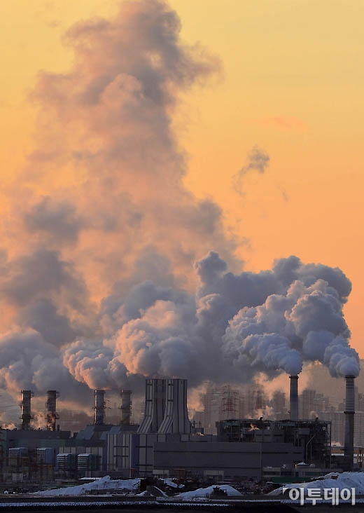 폭설 후 다시 전국적인 한파가 찾아온 7일 인천 영종대교에서 바라본 서부발전소의 굴뚝에서 연기가 피어오르고 있다.
