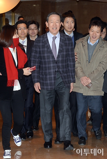 허창수 전경련 회장이 7일 오전 소공동 플라자호텔에서 열린 전경련 정기이사회에 참석하며 취재진의 질문을 받고 있다. 이날 열린 이사회에서는 허창수 회장과 정병철 부회장의 연임 여부를 논의할 예정이다.