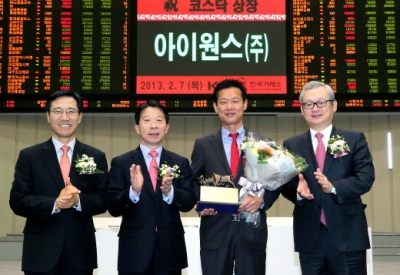 한국거래소 코스닥시장본부는 7일 서울사옥 종합홍보관에서 특수목적용 기계제조 업체인 아이원스의 코스닥시장 상장기념식을 개최했다. 김원식 코스닥협회 부회장(왼쪽부터), 최홍식 한국거래소 코스닥시장본부장, 이문기 아이원스 대표, 정영채 우리투자증권 IB사업부 대표 등이 기념촬영을 하고 있다.