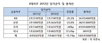 7일 금융권에 따르면 KB·우리·신한·하나금융지주 등 4대 금융지주사들은 지난해 총 7조4431억원의 순익을 달성했다. 이는 2011년 8조8378억원 보다도 15.8%포인트(1조4000억원) 감소한 수치다. 하나금융의 외환은행 인수에 따른 부의 영업권 9500억원을 제외하면 순이익 감소폭은 실질적으로 2조3500억원으로 집계됐다.