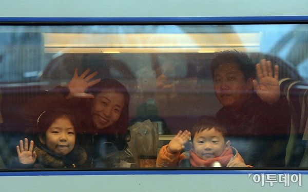 서울 아침 최저기온이 영하 17도까지 떨어지는 등 전국적으로 한파가 몰아치고 있지만 설을 앞두고 고향으로 향하는 가족들의 얼굴엔 온기가 가득하다. 8일 오전 서울역 열차 안에서 한 가족이 손을 흔들며 고향으로 향하고 있다. 노진환 기자 myfixer@