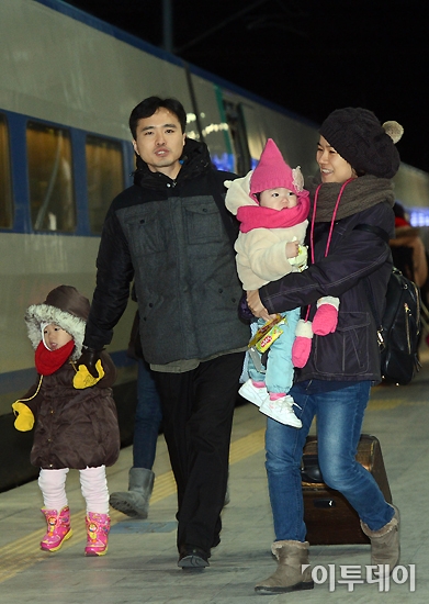 서울 아침 최저기온이 영하 17도까지 떨어지는 등 전국적으로 한파가 몰아치고 있지만 설을 앞두고 고향으로 향하는 시민들의 얼굴엔 따뜻함이 가득하다. 8일 오전 서울역에서 한 가족이 KTX 열차를 타고 있다. 노진환 기자 myfixer@