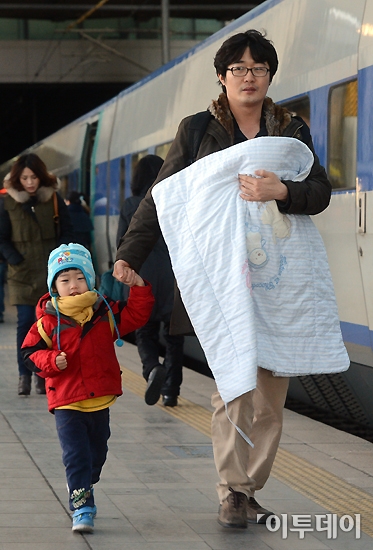 서울 아침 최저기온이 영하 17도까지 떨어지는 등 전국적으로 한파가 몰아치고 있지만 설을 앞두고 고향으로 향하는 시민들의 얼굴은 따뜻함이 가득하다. 8일 오전 서울역에서 한 가족이 아기들을 품에 안고 열차로 향하고 있다.