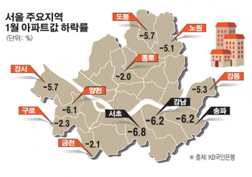 지난달 서울 아파트 가격이 1월 기준으로 13년 만에 가장 큰 낙폭을 기록했다.