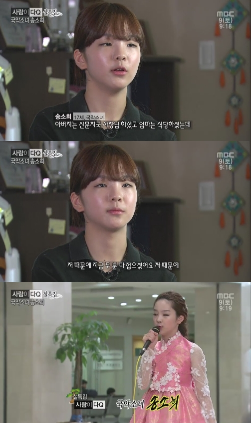 국악신동 송소희는 9일 방송된 MBC ‘사람이다Q’에서 아버지 어머니의 전 직업을 공개했다.