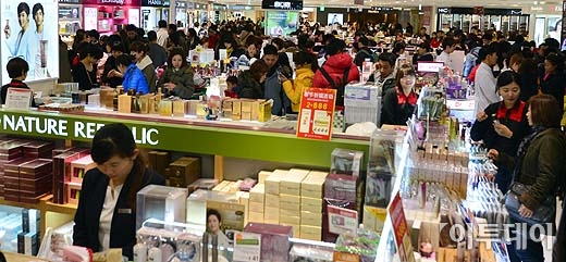 11일 서울 중구 소공동 롯데면세점 본점에서 중국최대 명절인 춘절(2월9~15일)을 맞아 한국을 찾은 중국인 관광객들이 쇼핑을 하고 있다. 한국관광공사는 춘절 연휴기간 중국인 관광객이 작년보다 25% 증가한 6만 3천명에 이를 것으로 내다 봤다.