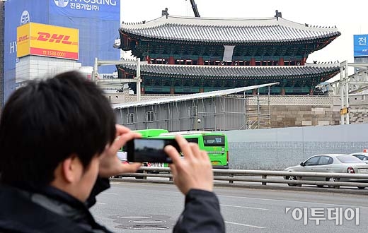 국보 1호 숭례문 화재사고가 발생한지 5년이 지난 12일 오전 숭례문 복원작업이 마무리 단계에 들어가면서 그 모습을 드러내고 있다. 숭례문은 오는 4월 복원공사를 마치고 완공될 예정이다.