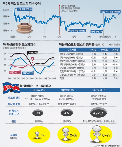 우리투자증권 강현철 투자전략팀장은 “북한 핵 이슈는 지난 2002년 12월 12일 실험 다음날 주가 2.4% 상승, 2003년 1월 10일 0.3% 하락, 2005년 2월 10일 0.2% 하락, 2006년 10월 9일 2.4% 하락, 2008년 8월 14일 0.6% 상승 등을 기록해 시장에 충격을 줬다고 보기는 어려운 재료"라고 말했다.