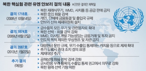 또 제재 대상을 늘릴 가능성도 있다. 현재 안보리의 제재를 받는 북한 단체는 17곳, 개인은 9명이다. 안보리는 이번 3차 핵실험에 관여한 인물과 기관을 추가 제재 대상으로 지정할 것으로 예상된다.