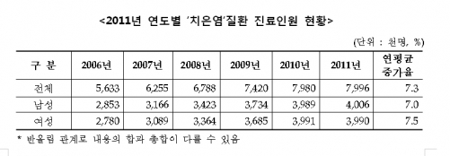 13일 국민건강보험공단에 따르면 최근 6년(2006~2011년) 동안의 치은염 질환 건강보험 진료비 지급자료를 분석한 결과 진료인원이 2006년 563만명에서 2011년 800만명으로 늘어나 연평균 7.3%의 증가율을 보였다.