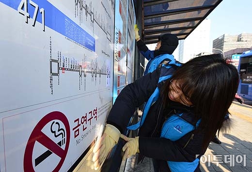 서초구 공무원 및 환경미화원들이 13일 오전 서울 서초구 양재동의 한 버스정류장에서 겨우내 잦은 폭설 등으로 얼룩진 버스정류장을 대청소 하고 있다.