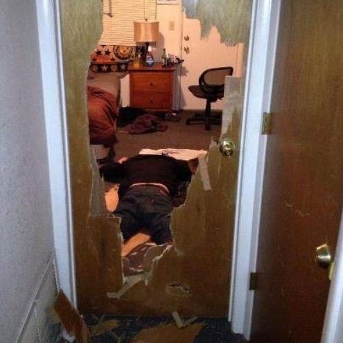 사진에는 한 남성이 헐크처럼 문을 뚫고 귀가한 장면이 담겨있다. '헐크같은 룸메이트' 게시자는 "한 미국인이 촬영해 공개했다"면서 "룸메이트가 파티에 간다며 나갔다가 새벽 4시에 꽝하는 소리가 들려 나와보니 친구가 문을 뚫고 귀가했다"는 설명이 덧붙어 있다.