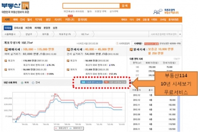 부동산정보업체 부동산114는 이달부터 자사 사이트(www.r114.com) 방문고객을 대상으로 ‘부동산114 10년 시세 무료보기 서비스’를 제공하고 있다고 13일 밝혔다.
