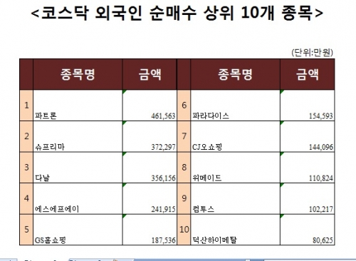 [코스닥 외국인 순매수 상위 10개 종목]