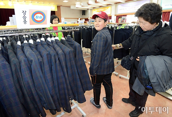 ‘중·고교생 교복 내리사랑 나눔장터’가 14일 오후 서울 동작구청 대강당에서 열렸다. 행사장을 찾은 예비 중학생이 교복을 입어보고 있다.