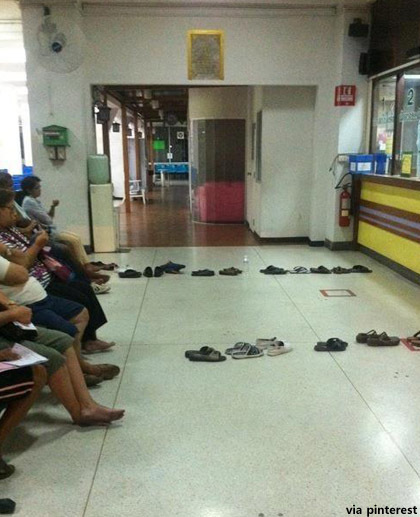 공개된 사진에는 슬리퍼가 길게 줄을 서 있다. 슬리퍼 주인으로 보이는 사람들은 맨발로 의자에 앉아 있다. 은행이나 마트 등지에서 사람 대신 슬리퍼를 이용해 줄을 서고 있는 것이다.