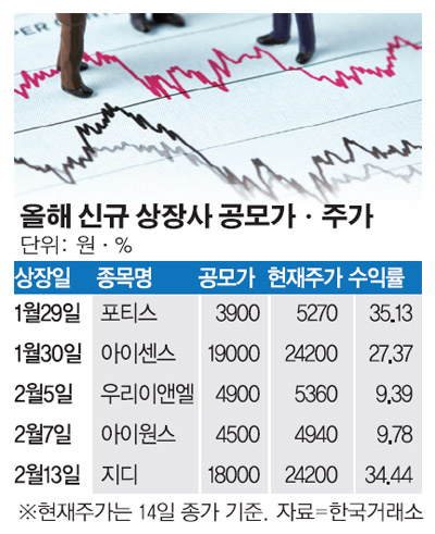 15일 한국거래소에 따르면 올해 상장한 포티스, 아이센스, 우리이앤엘, 아이원스, 지디 등 새내기주 5곳의 공모가 대비 평균 상승률(14일 종가 기준)은 23.22%로 높은 상승폭을 보였다.