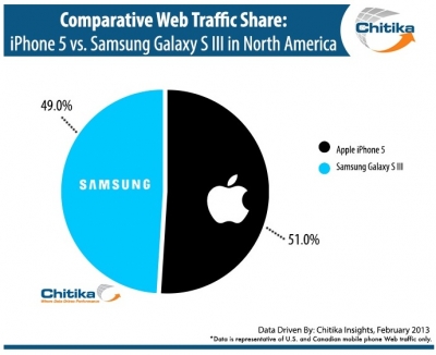 미국 온라인 광고업체 치티카가 지난 1일부터 9일까지 미국과 캐나다에서 두 기업이 지난해 출시한 대표 상품 아이폰5와 갤럭시S3의 트래픽만을 조사한 결과 아이폰5가 51%, 갤럭시S3가 49%를 차지해 거의 비슷한 수준으로 나타났다.