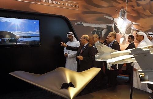 셰이크 모하메드 빈 자예드 알-나하얀(왼쪽) 아부다비 왕세자가 17일(현지시간) 장-이브 드 리앙(왼쪽에서 두 번째) 프랑스 국방장관과 함께 아부다비국제전시센터에서 열린 국제방위산업전(IDEX)을 둘러보고 있다. 아부다비/AFP연합뉴스