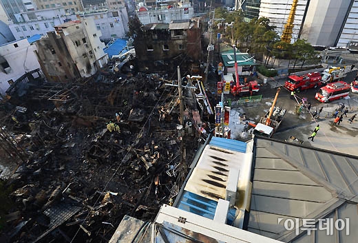 지난 밤 화재로 잿더미가 된 서울 인사동 먹자골목에서 18일 오전 소방관들이 폐허를 뒤지며 잔불을 진화하고 있다.