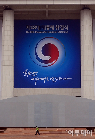 제18대 대통령 취임식을 일주일 앞둔 18일 오전 국회의사당 본관 앞 취임식장 준비가 한창인 가운데 ‘희망의 새 시대를 열겠습니다’란 취임식 슬로건이 적힌 현수막이 걸려있다.
