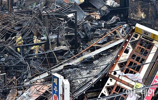 지난 17일 밤 서울 종로구 인사동의 한 식당 건물에서 가스폭발로 추정되는 화재가 발생해 이 일대 건물 6개동이 전소됐다. 18일 오전 소방대원들과 경찰들이 화재현장을 조사하고 있다.