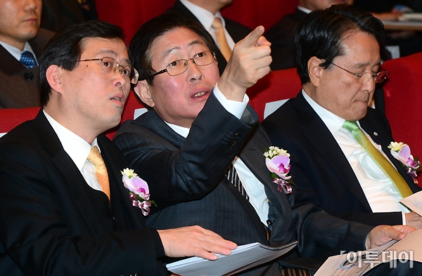한전-중소기업 동반성장 정책설명회가 18일 오후 삼성동 한국전력에서 열렸다. 조환익 한국전력 사장(가운데)과 정재훈 산업경제 실장(왼쪽)이 이야기를 나누고 있다. 오른쪽은 유장희 동반성장위원장.