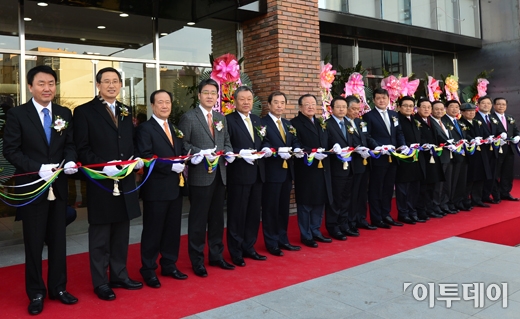 프리미엄 경제신문 이투데이가 19일 오전 서울 동작구 여의대방로에 마련한 신사옥에서 입주식을 가진 가운데 김상우 대표이사 및 참석 내빈들이 테이프 커팅식에 앞서 기념촬영을 갖고 있다. 올해로 창립 7주년, 창간 3주년을 맞은 이투데이는 이번 신사옥 입주를 통해 고품격 경제지로의 새로운 위상정립을 선언한 ‘희망 2013, 도약 원년’의 힘찬 출발을 맞이했다.