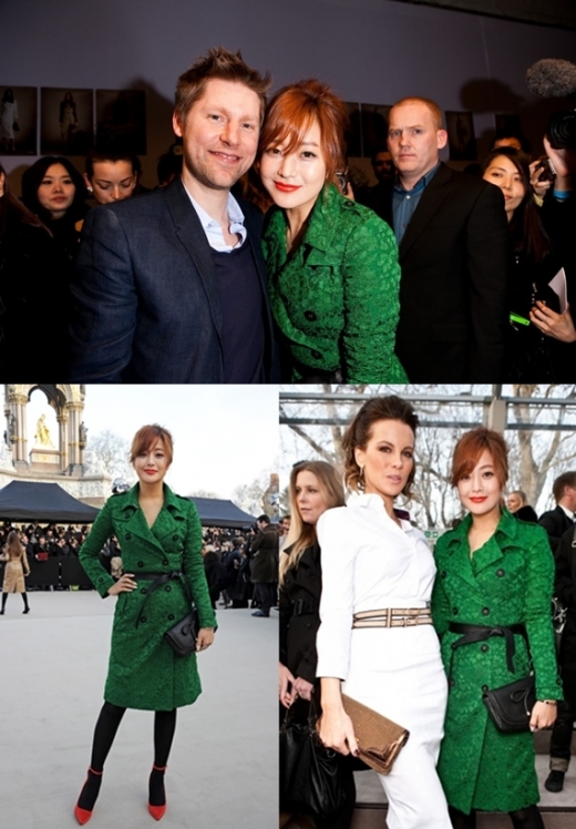 이날 김희선은 그린 컬러의 버버리 프로섬 트렌치코트와 레드힐로 우아한 패션을 선보였다. 특히 할리우드 배우 케이트 베킨세일과 나란히 찍은 사진에서도 뒤지지 않는 미모를 자랑해 눈길을 끌었다.