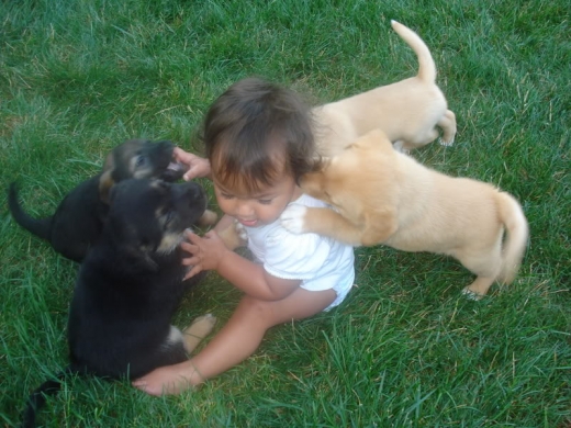 강아지들은 앞발과 혀로 아기의 손목과 목덜미를 간지럽히고 있어 웃음을 자아낸다.