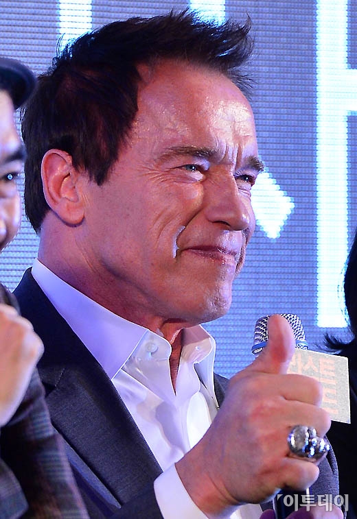 영화 '라스트 스탠드' 홍보차 내한한 아놀드 슈왈제네거가 20일 서울 여의도 콘라드 호텔에서 공식 기자회견을 가진 가운데 포즈를 취하고 있다.