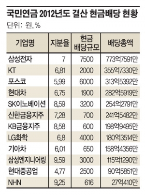 국민연금이 지분 1778만6652주(6.81%)를 보유해 최대주주로 올라 있는 KT는 주당 2000원의 현금배당을 실시키로 했다. 국민연금이 받을 배당금은 355억7330만원에 달한다.