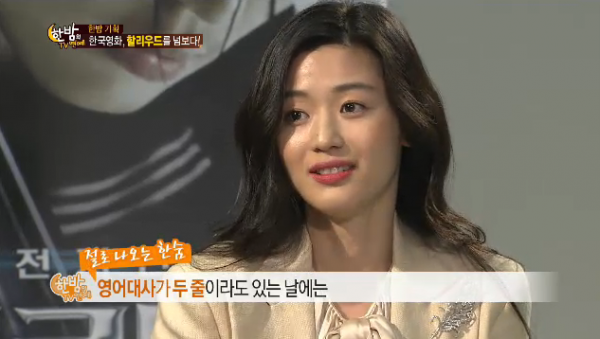 전지현은 20일 밤 방송된 SBS ‘한밤의 TV연예’에 출연했다. 전지현은 할리우드를 넘보는 배우로서 소개됐다. 그러나 전지현은 영화 대사가 가장 어려웠다고 말했다. 방송과의 인터뷰에서 그는 “영어 두줄 대사가 너무나 떨리고 어려웠다”고 말해 관계자들을 놀라게 했다.