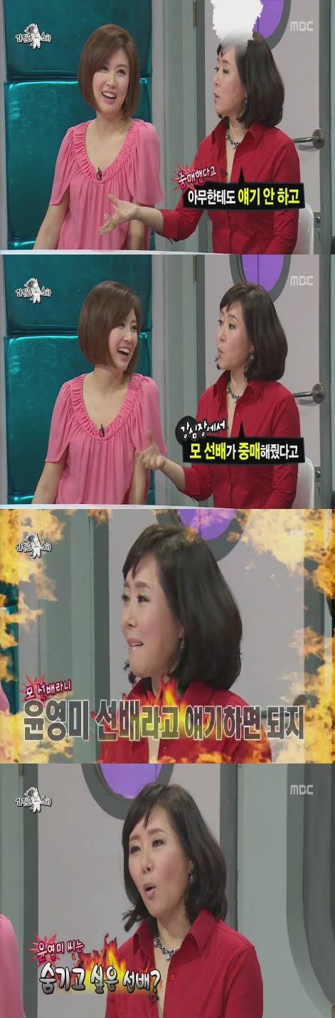 이에 윤영미는 "과가 다르다. 걔는 내숭과다"라고 말문을 열었다. 이어 "내가 중매를 서줬는데 아무한테도 얘기 안 하고 '강심장'에서 모 선배가 중매해줬다고 하더라"라며 불만을 터뜨렸다.