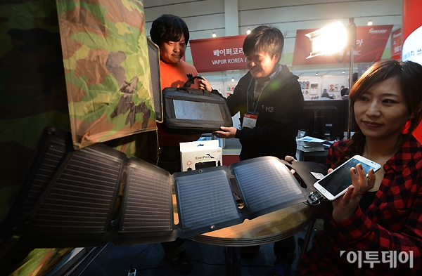 ‘2013 서울국제스포츠레저산업전’이 21일 오전 서울 삼성동 코엑스에서 개최됐다. H3P가 태양광 텐트, 태양광 충전 가방, 패드 등 태양광 브랜드 에너플렉스(EnerPlex) 제품을 소개하고 있다. 노진환 기자 myfixer@