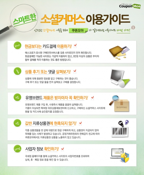 진현석 쿠폰모아 본부장은 “일부 소셜커머스에서 발생하고 있는 불미스런 사건으로 인해 건전한 소셜커머스 공급자와 사용자가 더 이상 피해가 없도록 간단하지만 핵심적인 5가지 소셜커머스 이용습관법을 마련했다”며 “보다 안전하고 편리한 소셜커머스 문화가 정착되길 바란다”라고 설명했다.