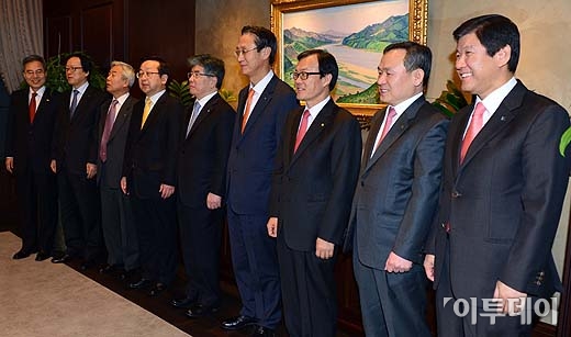 김중수 한국은행 총재가 22일 오전 서울 중구 남대문로 한국은행 본관에서 열린 ‘2013년 2월 금융협의회’에 참석해 시중 은행장들과 기념촬영을 하고 있다. 이날 금융협의회에는 민병덕 국민은행장, 이순우 우리은행장, 신충식 농협은행장, 조준희 중소기업은행장, 김종준 하나은행장, 하영구 씨티은행장, 김용환 수출입은행장, 이주형 수협신용대표이사 등이 참석했다.
