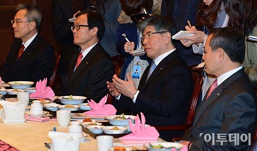 김중수 한국은행 총재가 22일 오전 서울 중구 남대문로 한국은행 본관에서 열린 ‘2013년 2월 금융협의회’에서 시중 은행장들과 이야기를 나누고 있다. 이날 금융협의회에는 민병덕 국민은행장, 이순우 우리은행장, 신충식 농협은행장, 조준희 중소기업은행장, 김종준 하나은행장, 하영구 씨티은행장, 김용환 수출입은행장, 이주형 수협신용대표이사 등이 참석했다.
