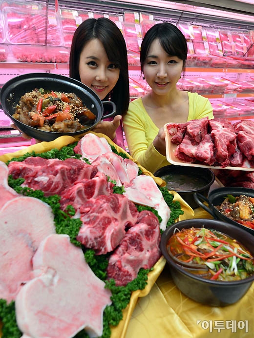 이마트가 24일 오전 용산점 축산매장에서 살코기가 붙은 사골을 선보이고 있다. 이날 사골은 한우 가격이 폭락함에 따라 소비 촉진을 위해 새로 개발하여 선보인 것으로 목뼈 1,200원(찜용 100g), 한우냉장힘줄 1,500원(100g)이다.