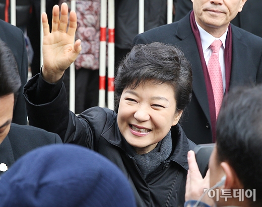 [사진공동취재단]박근혜 대통령이 25일 오전 서울 강남구 삼성동 자택에서 나와 시민들과 인사를 나누고 있다. 첫 여성 대통령 시대를 여는 제18대 대한민국 박근혜 대통령의 취임식은 국회의사당 광장에서 약 7만명의 국민이 운집한 가운데 세대를 아우르는 국민대통합을 기치로 열린다.