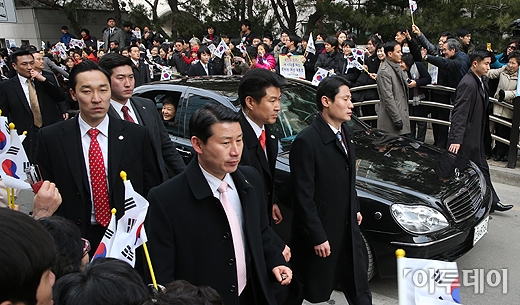[사진공동취재단]박근혜 대통령이 25일 오전 서울 강남구 삼성동 자택에서 나와 시민들과 인사를 나누고 있다. 첫 여성 대통령 시대를 여는 제18대 대한민국 박근혜 대통령의 취임식은 국회의사당 광장에서 약 7만명의 국민이 운집한 가운데 세대를 아우르는 국민대통합을 기치로 열린다.