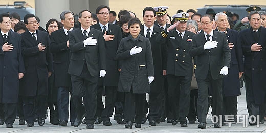 [사진공동취재단]취임식을 앞두고 있는 박근혜 대통령이 정부대표를 비롯해 국가유공자 및 현충원 안장 유가족 등과 함께 25일 오전 서울 동작구 국립현충원을 찾아 참배하고 있다.