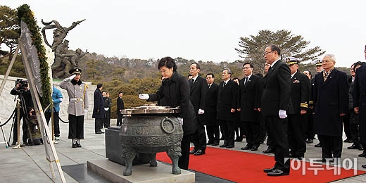 [사진공동취재단]취임식을 앞두고 있는 박근혜 대통령이 정부대표를 비롯해 국가유공자 및 현충원 안장 유가족 등과 함께 25일 오전 서울 동작구 국립현충원을 찾아 참배하고 있다.
