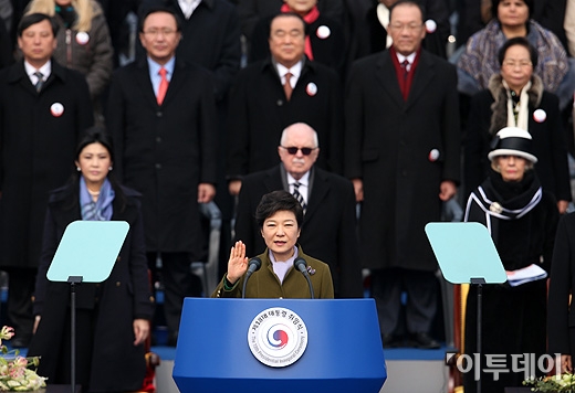 [사진공동취재단]박근혜 대통령이 25일 서울 여의도 국회의사당 광장에서 열린 18대 대통령 취임식에서 취임선서를 하고 있다.