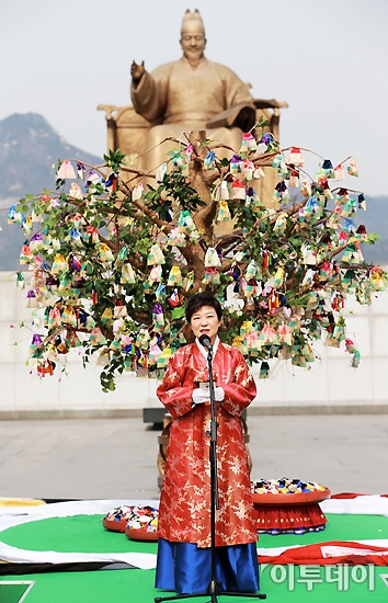 [사진공동취재단]대한민국 18대 대통령에 공식 취임한 박근혜 대통령이 25일 서울 세종로 광화문 광장에서 열린 '희망이 열리는 나무' 제막식에서 국민의 희망메시지를 낭독하고 있다.