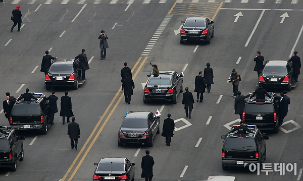 [사진공동취재단]박근혜 제18대 대통령이 25일 오전 서울 여의도 국회의사당에서 열린 취임식을 마친 후 국회의사당을 빠져 나가며 시민들의 환호에 답하고 있다.