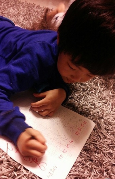 사진 속에는 엎드려 한글 공부를 열심히 하고 있는 모습이 담겨있다. MBC 예능프로그램 ‘일밤-아빠 어디가’에서 순수하면서 엉뚱한 모습으로 많은 사랑을 받고 있는 준수는 한글을 읽지 못한다는 사실이 알려지면서 더욱 화제가 됐다.